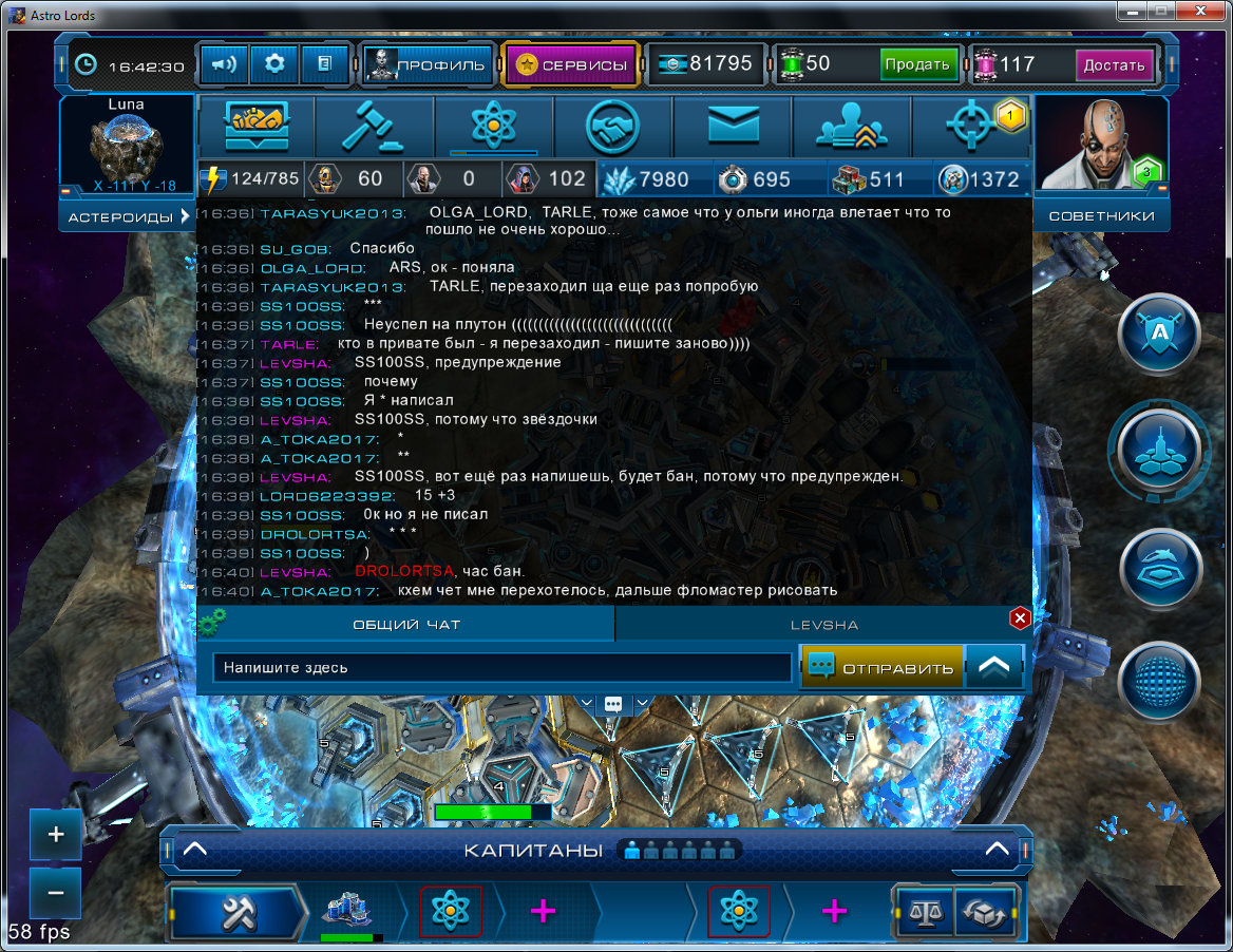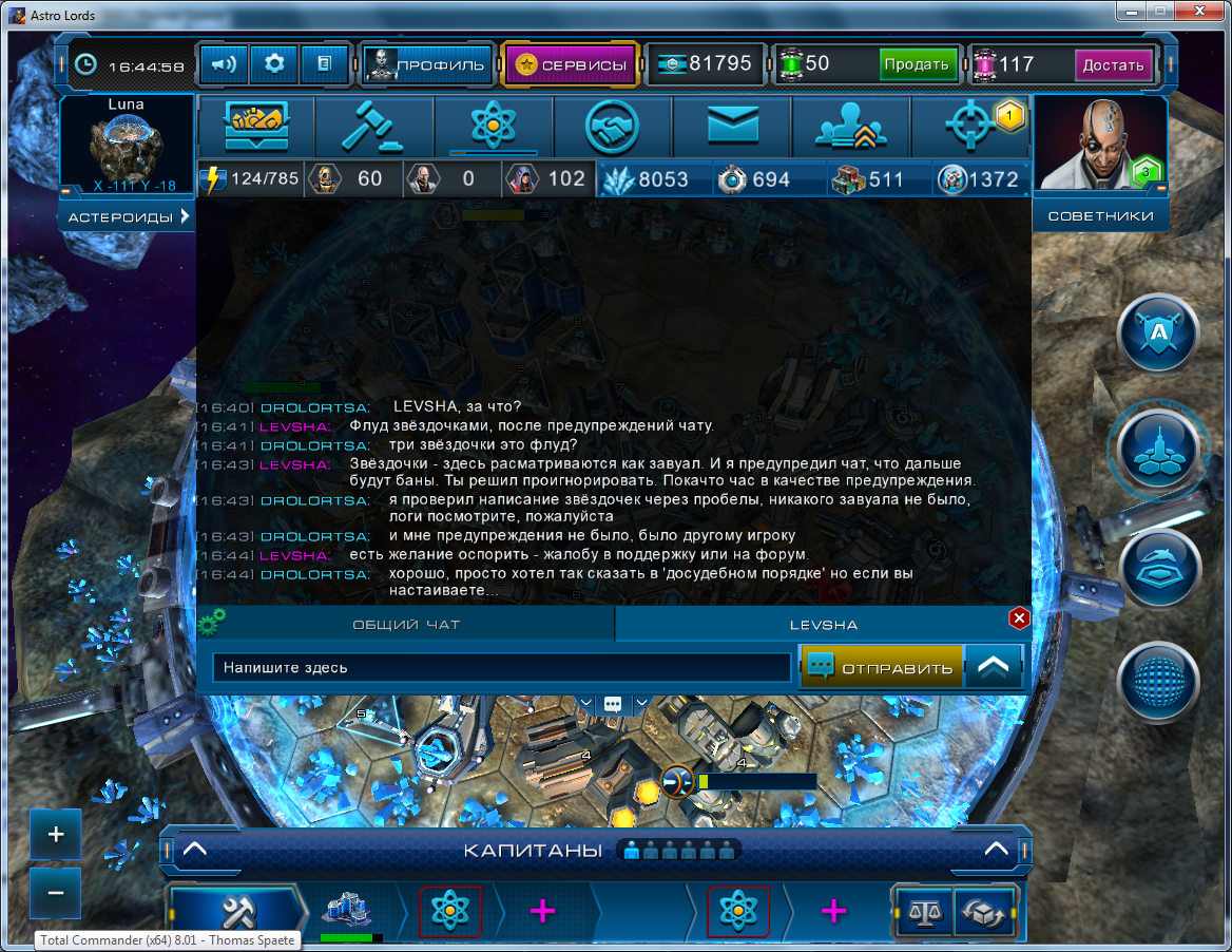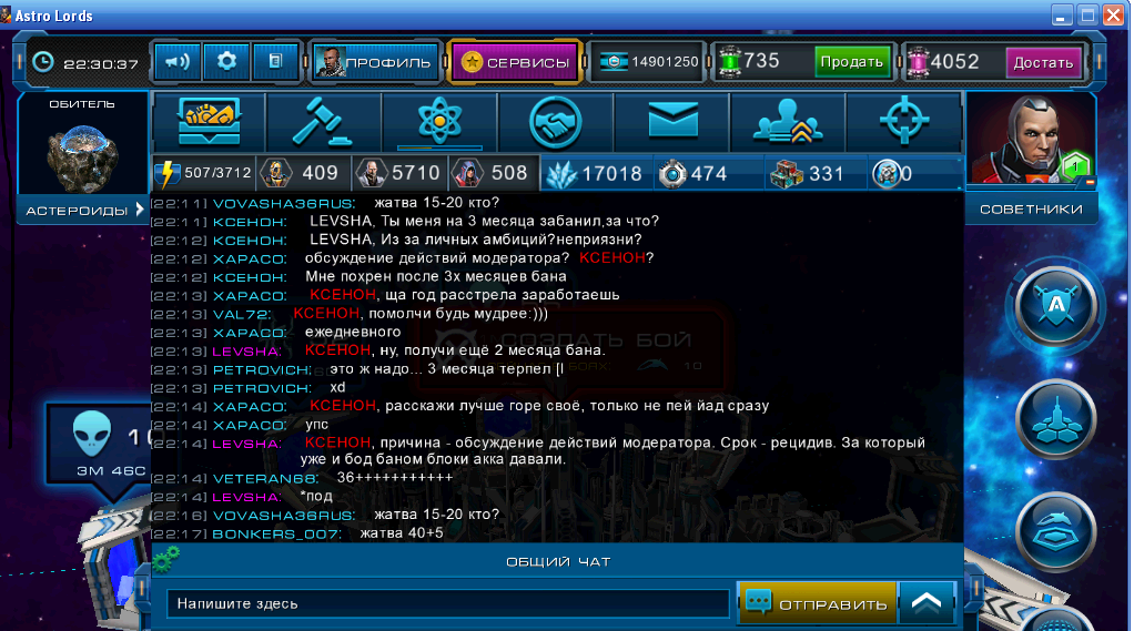 Текстовый чат игры Astro Lords: Oort Cloud подразделяется на: общеигровой чат арены, боевой чат, чат-каналы созданные игроками и сообщения личной переписки.