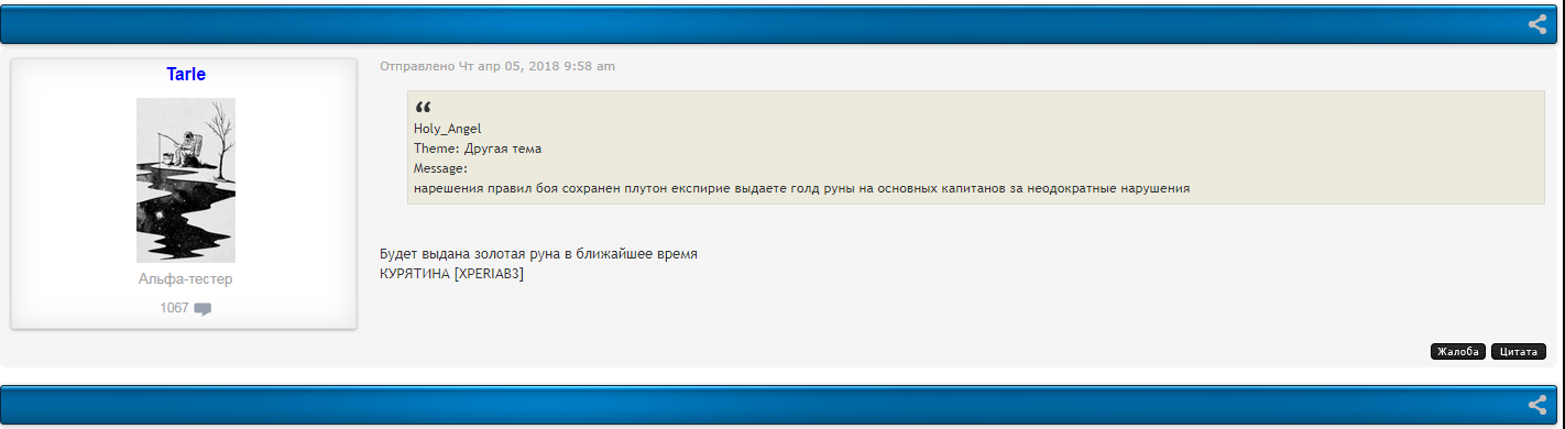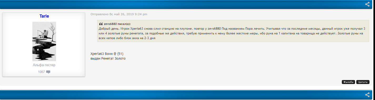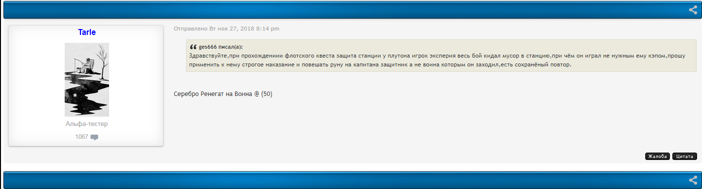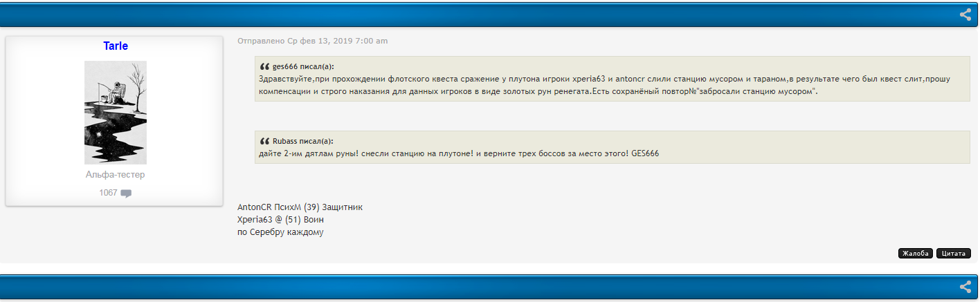 xperia63 писал(а):У меня был квест крепость пве трое с арены ( повтор сушка в непонятках ) и т.к время квеста было уже ограничено я запустил в надежде что кто то поможет и игрок zevs6880 он же сушка зашел в бой и сначала мешал кидал в меня силовые (видно подумал что это ПВП бой) , а когда понял что это ПВЕ не стал помогать , хотя чтобы это понять хватит времени 3-х секунд , и не стал помогать, а просто встал и слился об мобов ( то что был в морозе мог использовать нейтрализатор , но и после того как действие мороза закончилось у него было время поднять щит и пострелять ). Прошу выдать ему серебряную руну ренегата , чтобы в следующий раз читал название квеста , а раз уж зашел в бой то будь любезен воевать за команду.