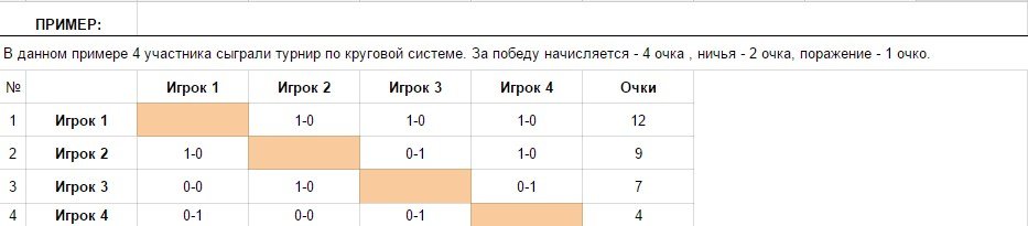 В качестве примера приведена таблица турнира по круговой системе, проведённого между 4 участниками (игрок-1 — игрок-4).