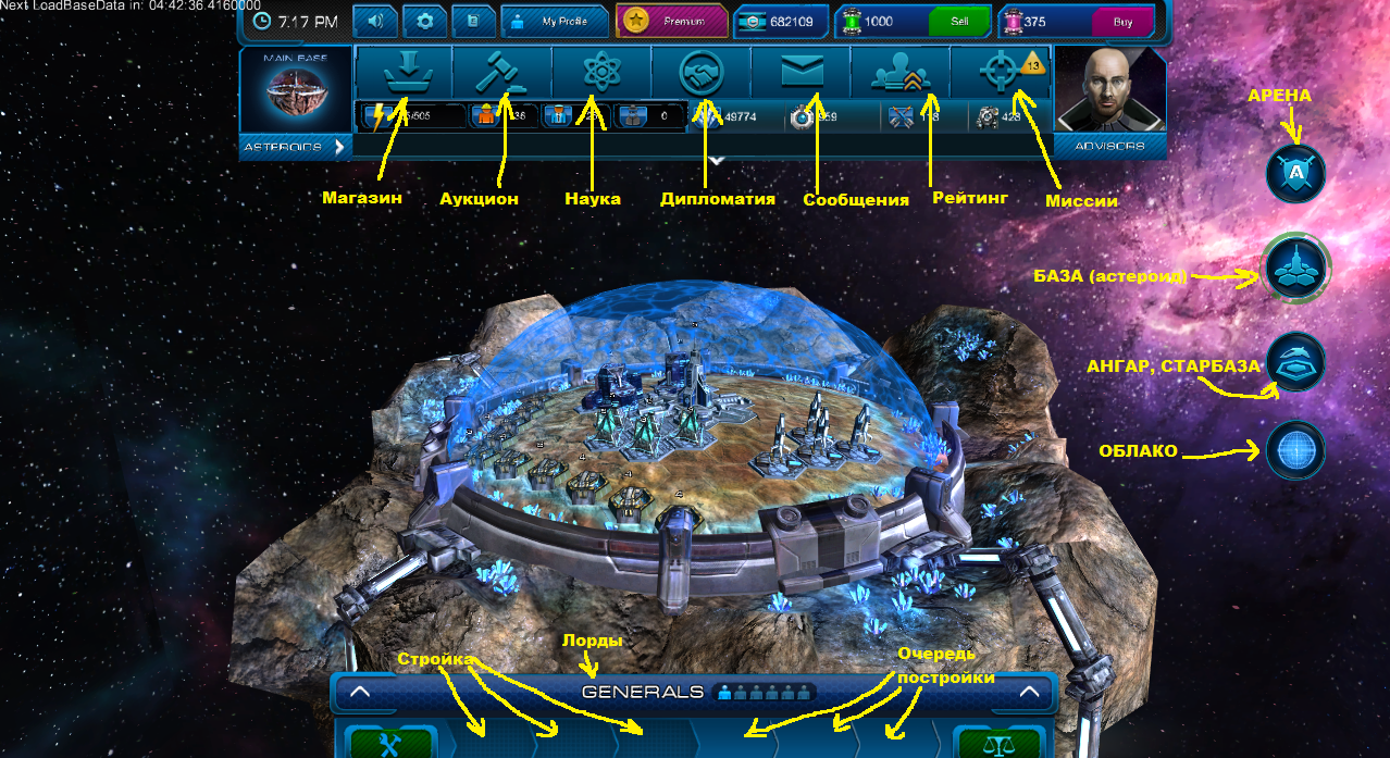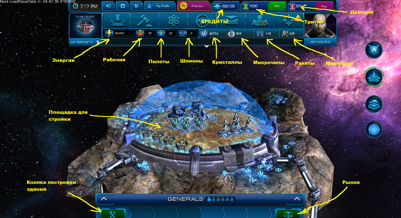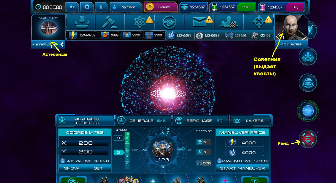 Данный раздел пока в разработке, так что поверхностно постараюсь объяснить. Предназначено для просмотра своего расположения и расположения игроков, отправления рейдов и других миссий, контроля движения астероида.