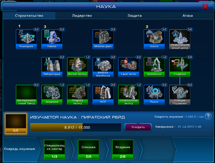 Первым делом учим науку в последовательности на скрине, дальше учим по желанию, т.к. вариантов развития много. В разделе защита в ближайшее время изучаем науку очередь строительства, полезная вещь.