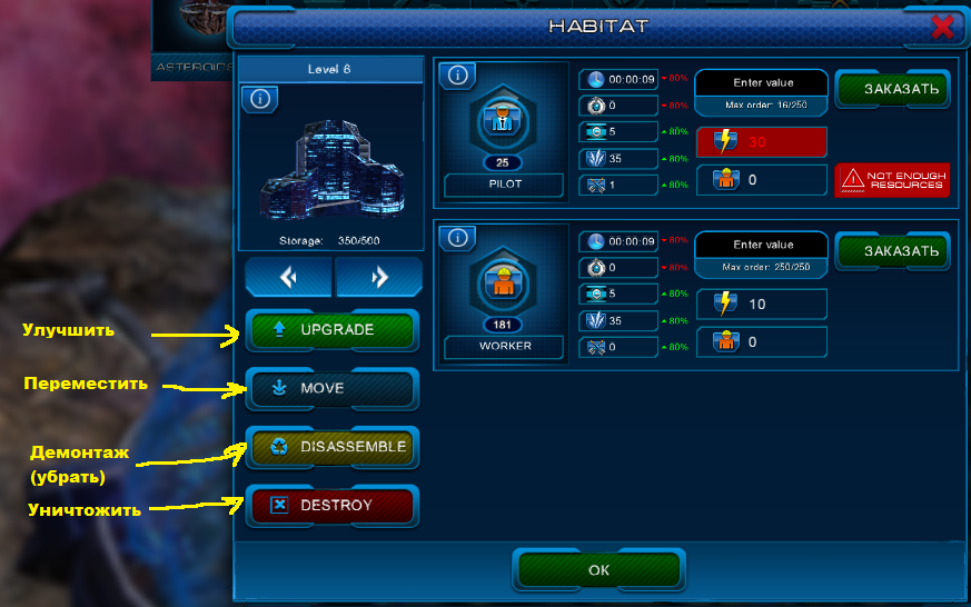А теперь запоминаем здания, которые обязательны для постройки - шахта, электричество, хабитат! Все остальные здания строим после постройки этих зданий. Шахта добывает кристаллы, электричество понятно что, хабитат создает рабочих, пилотов и шпионов.
