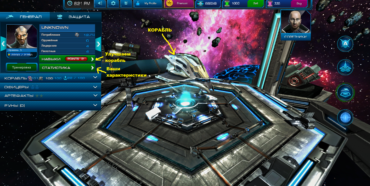 Точно таким же образом мы покупаем ракеты, лазеры, офицеров, руны и артефакты в магазине и загружаем их на корабль. Думаю это не составит Вам труда. Так же добавлю, что с увеличением уровня корабля, меняется вид корабля.