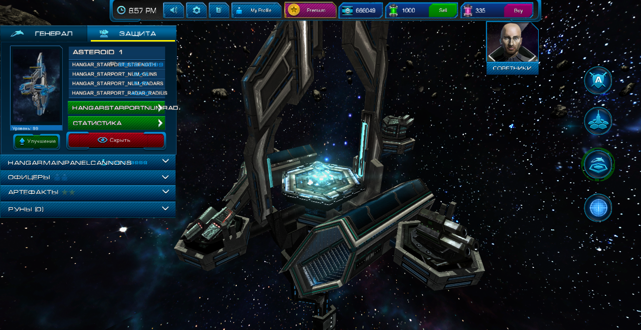 В ангаре есть вкладка защита, старбаза. Этот объект предназначен для защиты вашего астероида и его можно усовершенствовать, добавить амуницию и т.д. Т.к. это дело в разработке, то приведу только скрин.