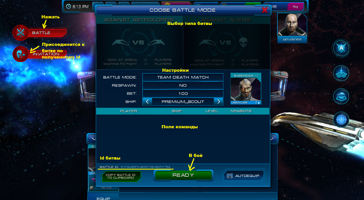 Есть несколько вариантов боев. Вы можете создать сами битву и разослать id бытвы своим друзьям. Бой можете проводить друг против друга или против пришельцев.