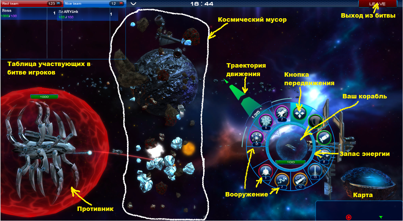 Когда Вы попали в бой, вам нужно уметь управлять кораблем и стрелять. Это не так сложно. Зажимаете кнопку движение и оттягиваете курсор в сторону куда планируете лететь, отпускаете и корабль перемещается. Точно так же со стрельбой, зажимаем-оттягиваем-отпускаем. Траектория полета снаряда - дуга, поэтому целимся немного выше. В некоторых снарядах (лазер, ослепляющий луч) траектория прямая линия, поэтому направляем курсор прямо в цель. У Вашего корабля есть энергия, с помощью нее Вы осуществляете стрельбу и перемещение, если энергия закончится, придется подождать чтобы она восстановилась. Следите за уровнем энергии, т.к. Вам придется перемещаться подальше от выстрелов противника.