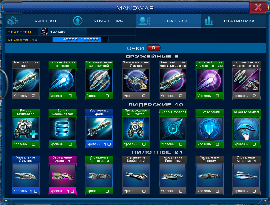 Что бы облегчить процесс раскачки, рекомендовал бы следующую последовательность: по 1му балу на залп простых ракет и дронов, затем пилотный навык вплоть до перехода на прем. фрегат (11 балов), далее максим навык Увеличение урона, после этого все остальное.